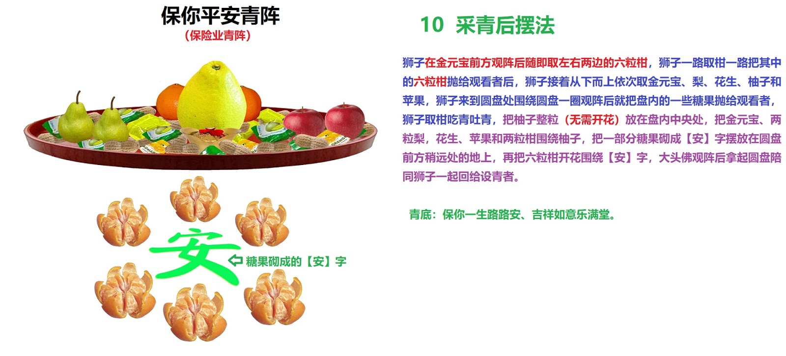 狮子在金元宝前方观阵后随即取左右两边的六粒柑,狮子一路取柑一路把其中的六粒柑抛给观看者后,狮子接着从下而上依次取金元宝、梨、花生、柚子和苹果,狮子来到圆盘处围绕圆盘一圈观阵后就把盘内的一些糖果抛给观看者,狮子取柑吃青吐青,把柚子整粒(无需开花)放在盘内中央处,把金元宝、两粒梨,花生、苹果和两粒柑围绕柚子,把一部分糖果砌成【安】字摆放在圆盘前方稍远处的地上,再把六粒柑开花围绕【安】字,大头佛观阵后拿起圆盘陪同狮子一起回给设青者。
